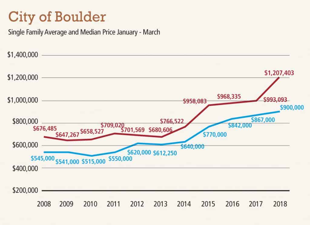 At the close of 2017, many were speculating that Boulder had finally reached a price ceiling at the limits of people’s purchasing power. The speculation continued that prices in Boulder would level off for some significant period of time as the city waited for buyers to accumulate more savings, wages to rise, etc. After all, approximately 40 percent of the homes sold in Boulder were over $1 million last year, so surely the pool of buyers able to buy a million-dollar home must be depleted, right? The first quarter of 2018 has largely disproven that theory.