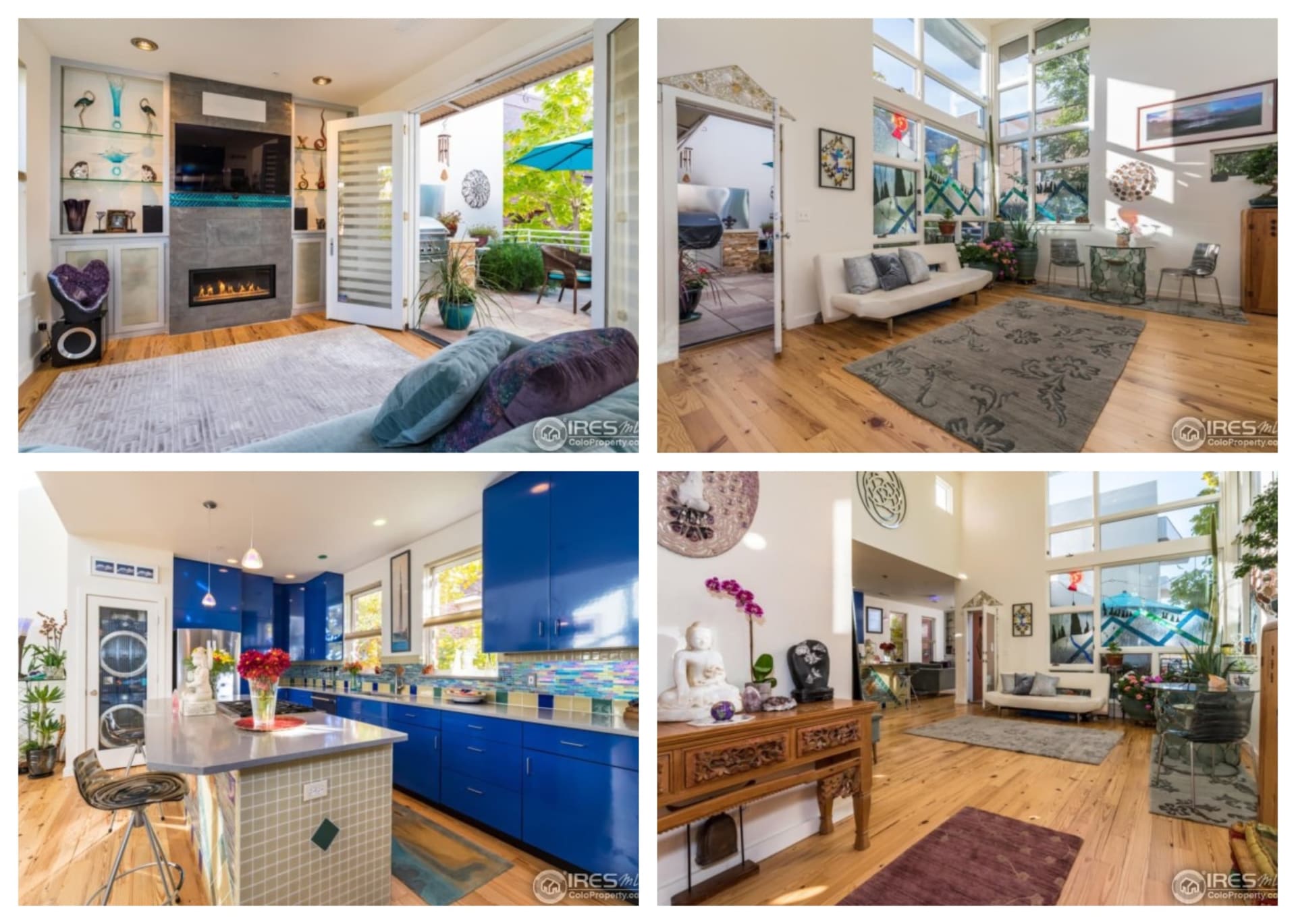 Metallic slate tile entry with an elegant wall of storage. Open with tall windows surrounded by mature trees. Soaring great room with 30′ ceilings. New glass-paneled doors. Reclaimed wood floor from the Chicago Mercantile Exchange. Modern art deco design with iridescent glass tile and lighting. Gas fireplace. French doors open to the patio with upgraded pavers and built-in gas grill. Master spa steam shower. New window coverings. Walk east to Pearl St Mall or west to Boulder’s finest trails. Can easily add a 2nd bedroom.